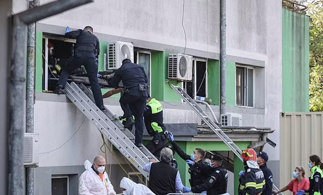 أفراد الطوارئ ينقلون ضحية على نقالة بعد حريق في قسم Covid-19 ICU بمستشفى الأمراض المعدية في ميناء كونستانتا على البحر الأسود ، رومانيا أمس